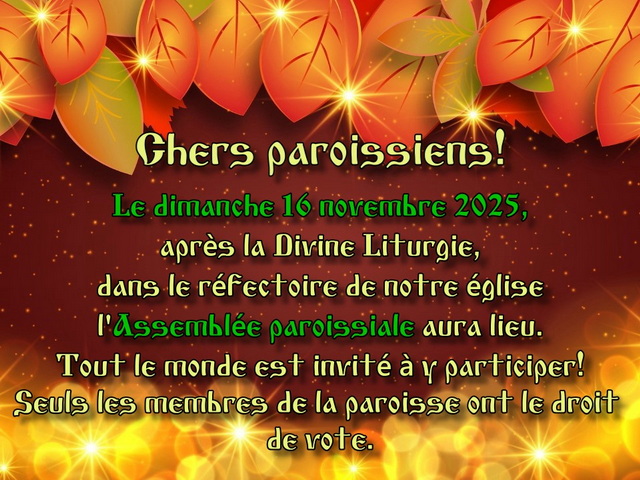 Le dimanche 16 novembre, après la Divine Liturgie, dans le réfectoire de notre église l’Assemblée paroissiale aura lieu.